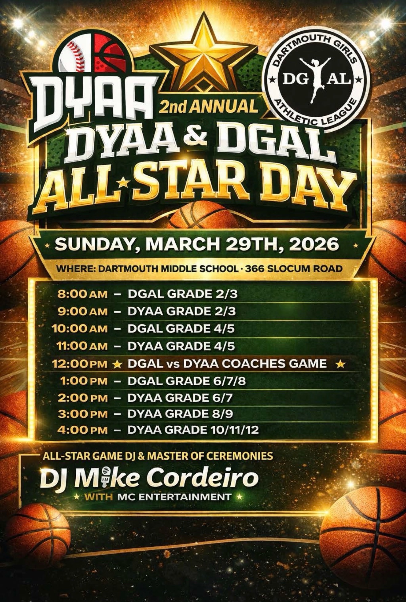 DYAA and DGAL All Star Day By dgalwebmaster | March 11, 2026 Join us for: DYAA and DGAL All Star Day Sunday, March 29th starting at 8AM Games for all ages 12 Noon DGAL vs DYAA Coaches Game DJ Mike Cordeiro with MC Entertainment will provide music and serve as the master of ceremonies Posted in Uncategorized