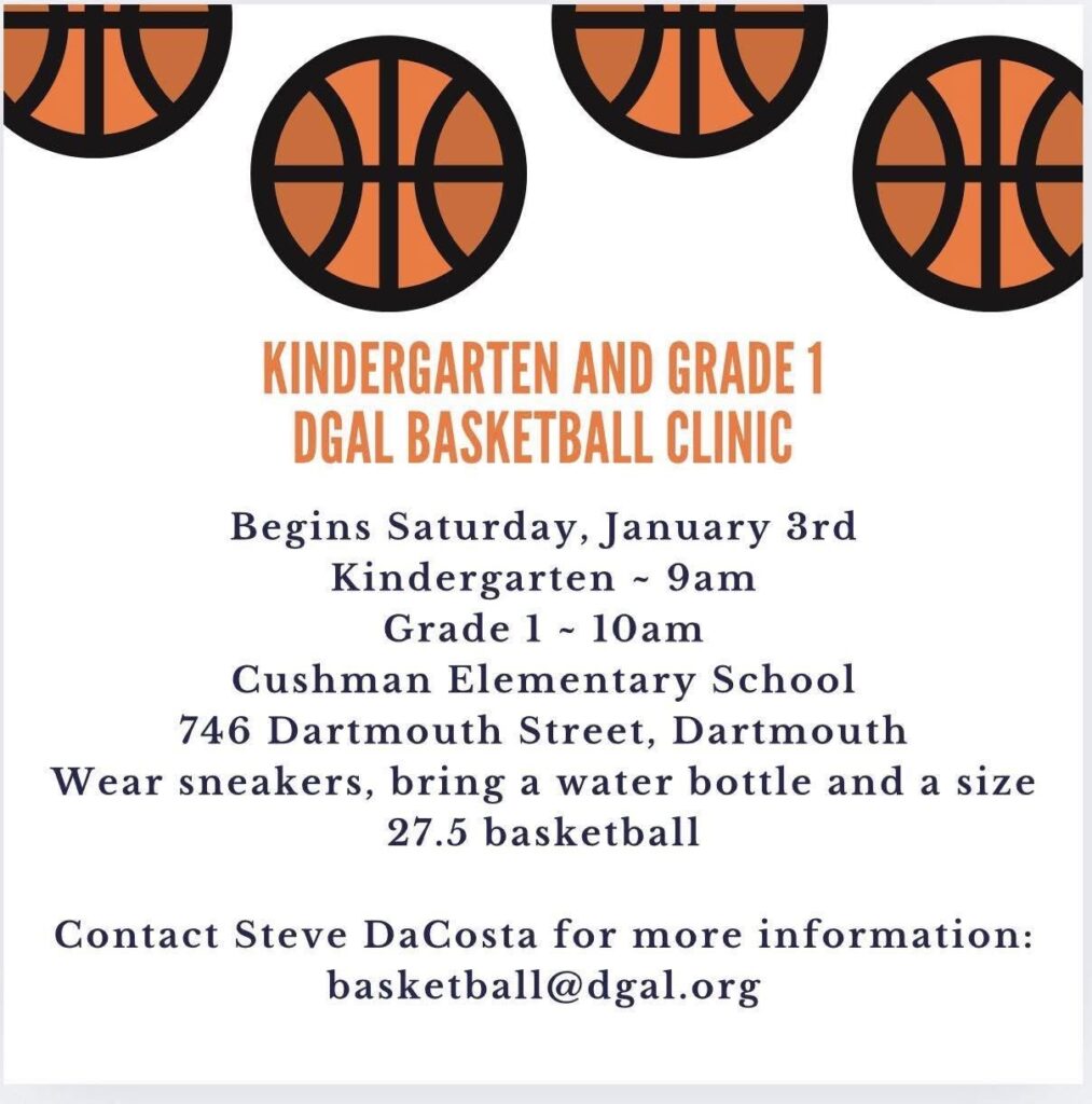 Kindergarten and Grade 1 DGAL Basketball Clinic Begins Saturday, January 3 Kindergarten @ 9AM & Grade 1 @ 10AM Location: Cushman Elementary School Wear Sneakers, Bring a Water Bottle, and a Size 27.5 Basketball Contact Steve DaCosta for more information: basketball@dgal.org